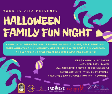 Community partners have come together to provide a FREE Halloween Family Fun Night! October 28th, 5-7 pm come join us at the Co+Creative Center, 137 Union St., New Bedford, for bilingual yoga with Tahais Martins, owner of Yoga es Vida, make-and-take + community art project with Beatriz & Company, face painting with local artist David Andrews, children's activities provided by local artist Ericka Andrews, refreshments provided by Samia Walker and Destination Soups, and we will end the night with a bonus special treat from Nelson Rapoza, owner of Broken Glass Projections, you don't want to miss this special show! Music will be playing throughout and costumes are encouraged but not required.